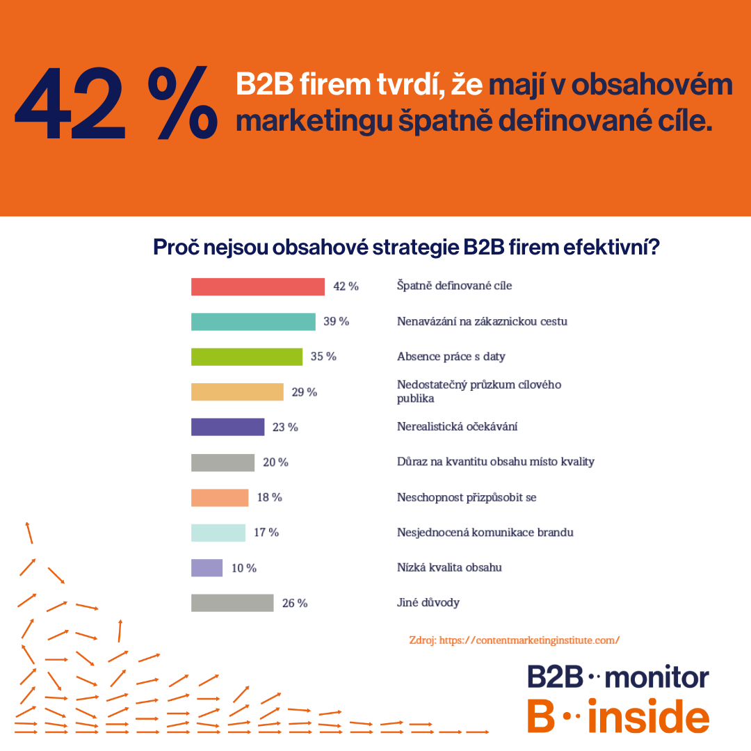 Co podle těchto firem stojí za nízkou efektivitou obsahového marketingu v B2B? Špatně definované cíle obsahového marketingu, nedostatečné provázání se zákaznickou cestou anebo absence práce s daty jsou hlavními důvody. Mezi další důvody patří nerealistická očekávání nebo důraz na kvantitu obsahu na úkor kvality.